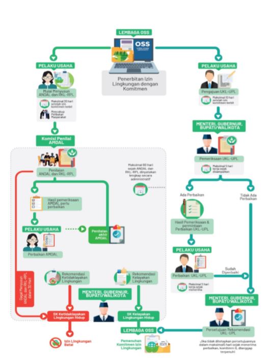 4. Penilaian UKL-UPL atau AMDAL sebagai Pemenuhan Komitmen. Untuk UKL-UPL, komitmen terpenuhi jika UKL-UPL mendapatkan persetujuan rekomendasi UKL-UPL dari Menteri, Gubernur atau Bupati/Walikota. Untuk AMDAL, komitmen terpenuhi jika AMDAL dinyatakan layak lingkungan oleh Menteri, Gubernur atau Bupati/Walikota. Tidak disyaratkan adanya penetapan yang mengkonfirmasi pemenuhan komitmen ini, sekalipun dalam praktek, Lembaga OSS akan menerbitkan kembali izin lingkungan yang komitmennya telah terpenuhi. Sementara, apabila pelaku usaha gagal memenuhi komitmennya, Izin Lingkungan dengan Komitmen dinyatakan batal.